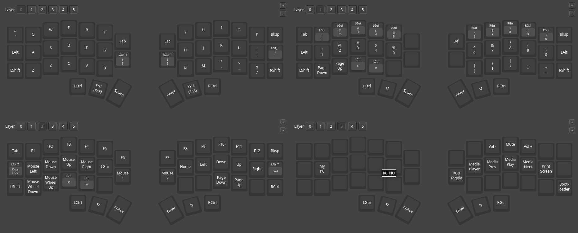 > режим magic fn который есть в anne pro 2 наверное тоже мог бы быть оче полезен - весишь magic fn на пробел, и тогда при зажатии пробела большим пальцем было бы продавливать удобно и asdfg, t, 5 В смысле пробел на нажатие, слой на удерживание? LT(слой, кейкод) функция.