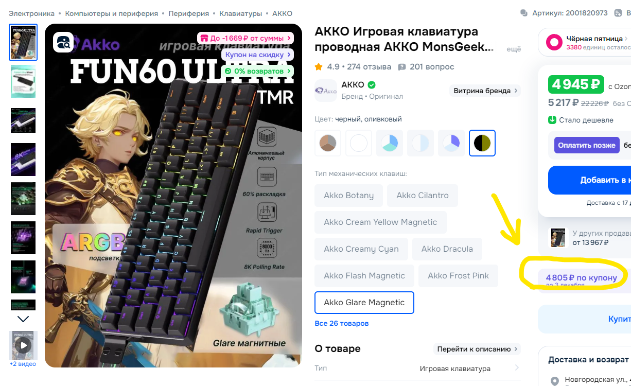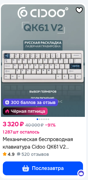 >>7587988 я вообще подозреваю что условная CIDOO QK61 V2 за 2 рубля это какой то сбой матрицы и больше китайцы такой ошибки не допустят возможно они ее слишком много сделали, не рассчитали и сейчас скидывают по себестоимости или ниже или та же магнитка fun60 pro, да огрызок 60%, да провод, да всратый софт, но стоит она 1.8р кек