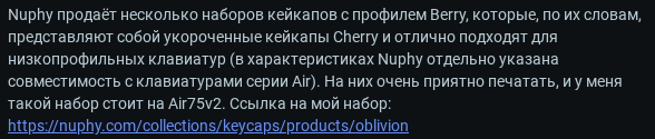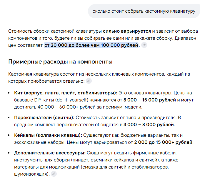 А если по-честному, вас не коробит от того, что порой кепки, сами собой хорошо отлитые и из качественного пластика, могут быть дороже, иногда – кратно, чем целые клавиатуры. То есть вот есть китайские готовые клавы за 3-3.5к, есть за 7к и чуть дороже, а есть вот просто сеты кепок за условные 8-9к. В какой момент, с каким уровнем достатка и как вообще происходит принятие этого факта? Особенно интересуют ответы людей с богатым опытом и насмотренностью.