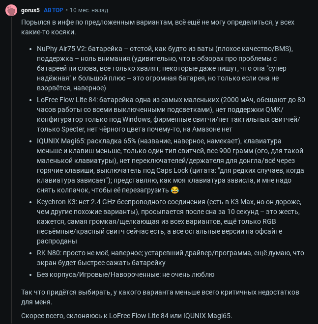 У меня старенькая 108-топре и пара гейхронов (Q3 и V4), все проводные, но недавно я в качестве дорожной взял гейхрон B1 — мембранно-ножничная херня, но мне понравилось то, что её заряжать надо пару раз в год, там энергоэффективный чип и менее прожорливая, хоть и функционально куцая, zmk вместо QMK (я скомпилировал и прошил QMK-VIAL в свои гейхроны для оверрайдов и макро-комбо типа "нажми <> чтобы выбрать текущее слово", выбрать строку, выбрать абзац вперед или назад и прочая хрень для работы с текстом). И ещё мне понравилась, что высота низкая, можно не использовать подставку под запястье. Навскидку из беспроводных механических программируемых клавиатур нашёл только Nuphy Node75, которая работает 1000 часов на одном заряде, полностью программируемая, и есть в низкопрофильном варианте (но с приличным ходом свичей 3,5 мм несмотря на малую высоту). Не нравится мне в ней только ебучая соевая 75-раскладка с втиснутыми в правый нижний угол стрелками и коротким шифтом. Я предпочитаю 60% и TKL. Есть что-нибудь ещё в таком плане? Обязательно, чтобы 1. Продвинутый функционал (программируемые слои для всех клавиш без ограничений, оверрайды, комбо, макро) 2. Низкопрофильная 3. Работает по радио 500+ часов на одном заряде. Подсветка и свистоперделки мне не нужны, а уёбищный "геймерский" дизайн крайне не желателен.