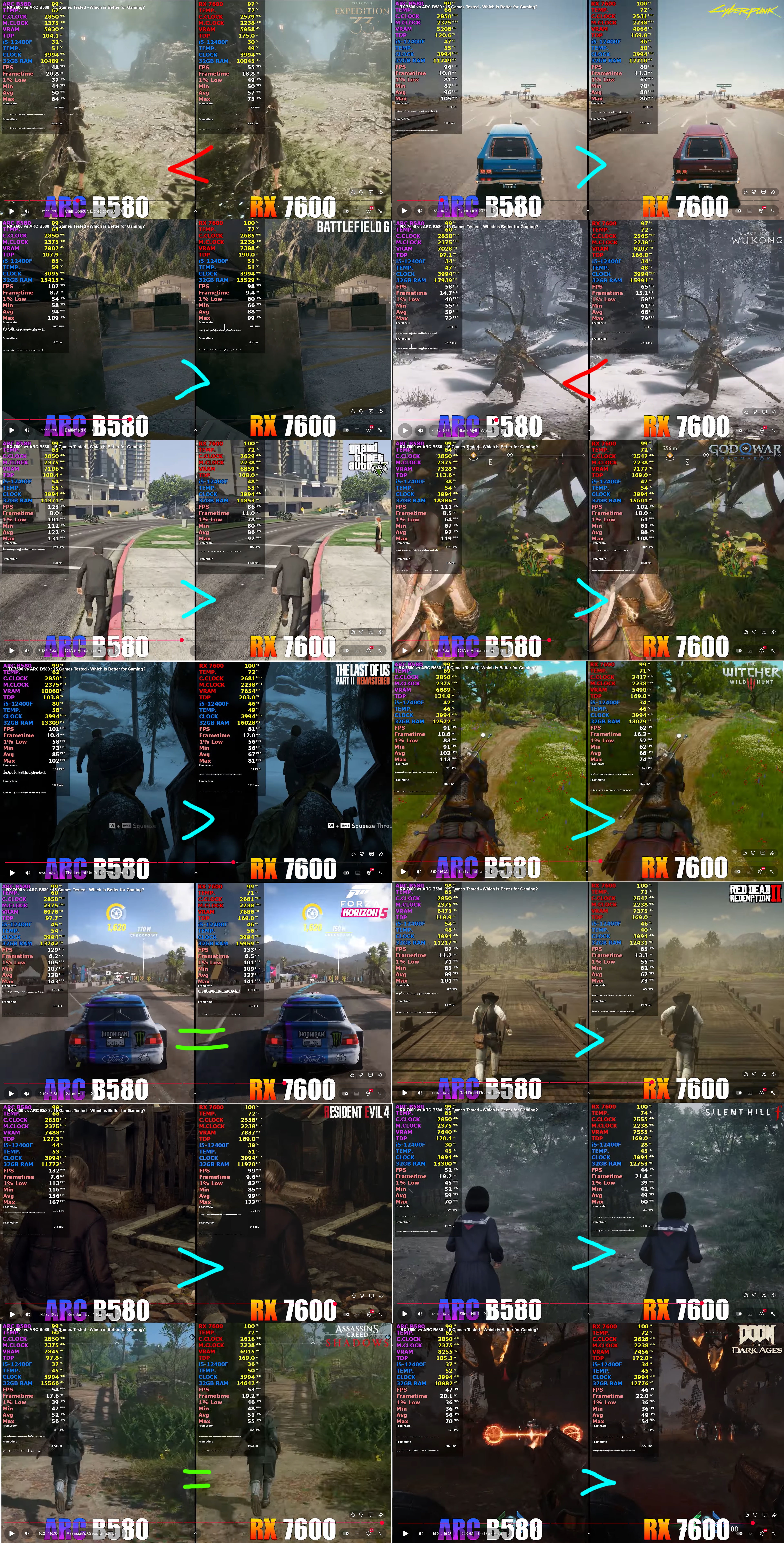 Идем ищем свежие сравнения b580 с твоим 7600, находим 2-недельный, дрова свежие 32.0.101.8250 и 25.11.1 на тот момент, с мониторингом, как мы всё это любим. https://www.youtube.com/watch?v=Fe-NxuMeNR0 Проц 12400, ддр5 6000сл30, FHD, т.е. автор подсуживать в сторону 8гб амд не стал выставляя квад, как и не стал брать топ проц под b580. Не буду черрипикать, а просто возьму ВСЕ протестированные игры сринами на конце тестового отрезка, в каких-то старых включено РТ, в каких-то новых - без РТ, настройки оставим на совесть автору: В 2 они равны, в 2 7600 выигрывает, в 10 сливается, иногда с разгромной разницей.