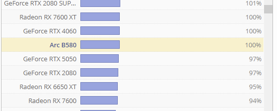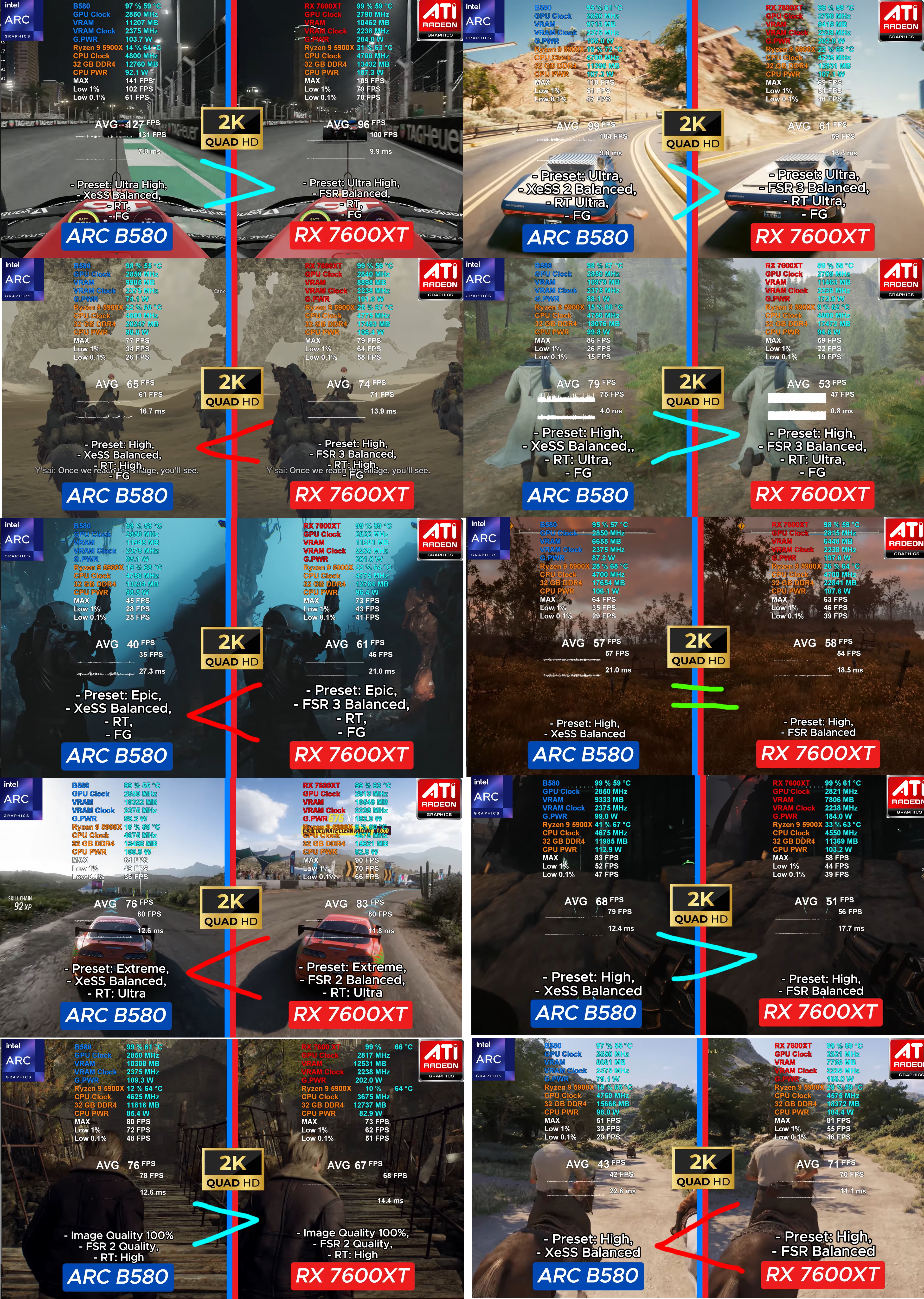Идем ищем другие видосы с мониторингом и тестовым отрезком в записи: https://www.youtube.com/watch?v=0gvh4eH2blI Тут видос 2месячный, дрова 32.0.101.7029 и 25.9.1, но b580 уже сравнивается с более дорогой 7600хт 16гб. Проц 5900х, тоже не ахти что 6+6 старого зен3, тоже не подсасывает "оверхеду" b580. Просто беру ВСЕ 10 игры, включение fg, апскейла и РТ оставляем на совести автора: В 1 они равны, в 4 7600хт с 16гб выигрывает, в 5 b580 идет впереди. Тут есть нюанс - для хроноса с релизом 5 сентября не выходило ни гейм реди драйвера, ни сейчас в патчноутах он не упоминался, оптимизон для него еще не завозили, для мафии олд кантри в следующих дровах еще были фиксы.