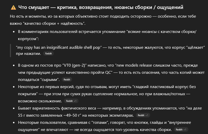 Почти прогрелся на рапу, но чет чтажпт отговаривает. Про эмсихоус все пишут о хорошей сборке и приятном пластике. По vt0 airmax нет ничего кроме билибили. Чтажпт говорит, что у рапу траблы c QC особенно у первых партий новинок. Но оптика на колесе и вес манят канеш.
