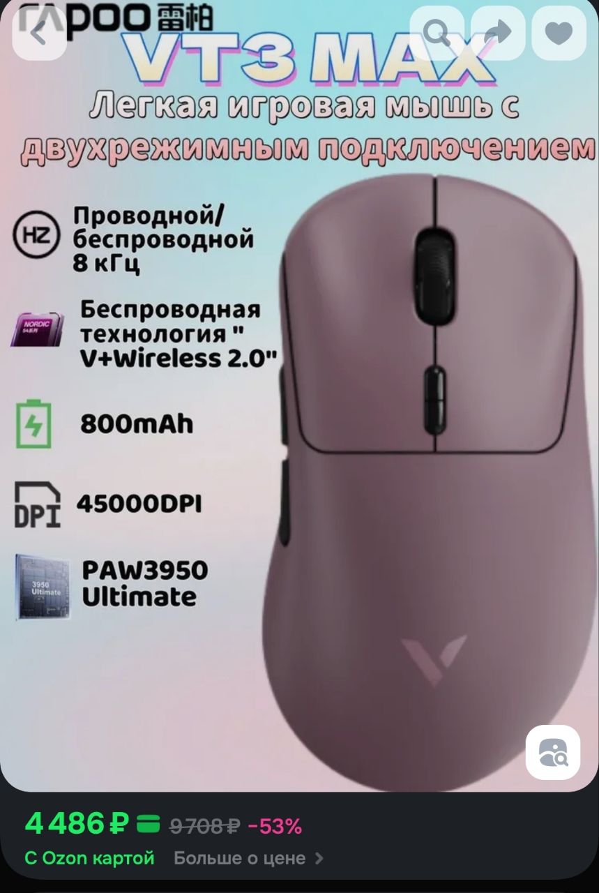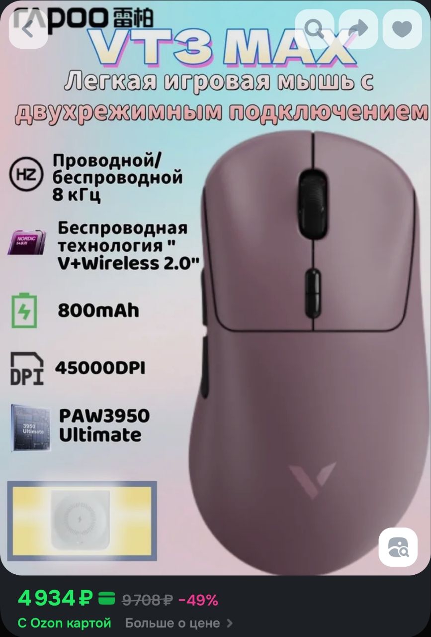 Долго искал мышку на замену g305 (она для меня идеальна, но там уже колесо разьебалось и иногда случайно прокручивается от микрокасания пальцем) и долго не мог найти, на что перейти. Уже думал орочи брать, она меньше по размеру, так и не решился ее взять. Также не хотел брать прямые клоны MCHOSE. В каких-то прошлых тредах, кто-то посоветовал Rapoo VT1 PRO MAX. Размеры почти идентичные, визуально приятная. В обзорах говорят аккум держит долго. И я решил заказать.
