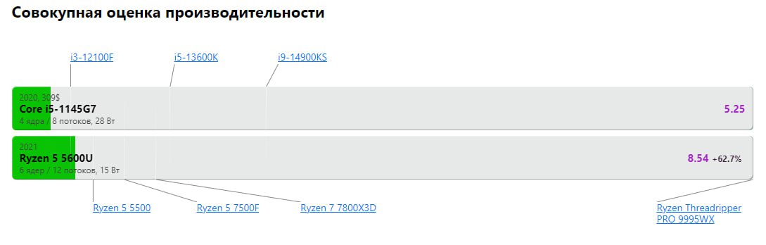 >>7602646 >Картинки говорят что проц слабее чем 5600u А тебе не хватит i5-го, двощи только 6 ядер вытянут? >И ещё насколько я знаю Хуёво знаешь. Вега вместо интегрированной не умела в динамическую память, кодеки, драйверы и сосала у Xe.