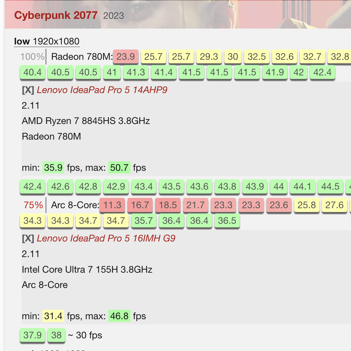 >>7602511 >>7604051 Для игр, надолго, на встройке и за дешево стоит рассматривать amd 780m или intel arc 8-core. У них хотя бы какой то аналог dlss есть. Все что старее не тянет даже киберпыньк на низких в 30 фпс. Интеловстройку занедорого найти трудно, а на амдшном 8745hs довольно много новых китайских ноутов/минипк повыходило последнее время за 30-40к.
