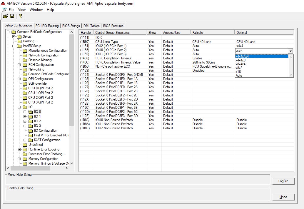 https://winraid.level1techs.com/t/request-asus-x99-a-pcie-bifurcation/35102/4 У меня UEFITool NE alpha 70 (Mar 13 2025) + AMIBCP 5.02.0034 + imhex-1.37.4-Windows-Portable-x86_64 Открываешь свой файл биоса в UEFITool и на капсуле делаешь extract body. Капсулу открываешь в AMIBCP. И дальше будешь методом тыка пробовать разные IIO и IOU в них. По одному за раз. Чтоб на моей заработал пик1 надо сделать пик2 auto->x4x4x4x4. Сохраняешь капсулу, открываешь в хекс редакторе, копируешь всё, и вставляешь в свой родной биос с адреса 800h с заменой. После этого надо зашить биос, но тебя твоя мать может нахуй послать. У меня на материнке есть кнопка принудительной прошивки, а тебе может и программатором надо будет.
