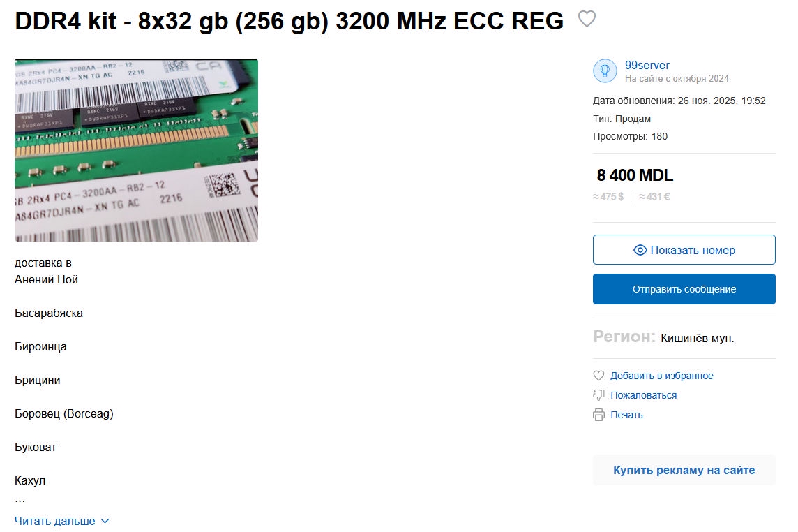 >>7597002 Есть плюсы проживания в Молдове. Фурами из европы везут б/у технику, а продавать некому. DDR4 256gb 3200 MHz ECC REG за 475$ продаётся. Мне кажется на авито раза в 2 дороже была бы.