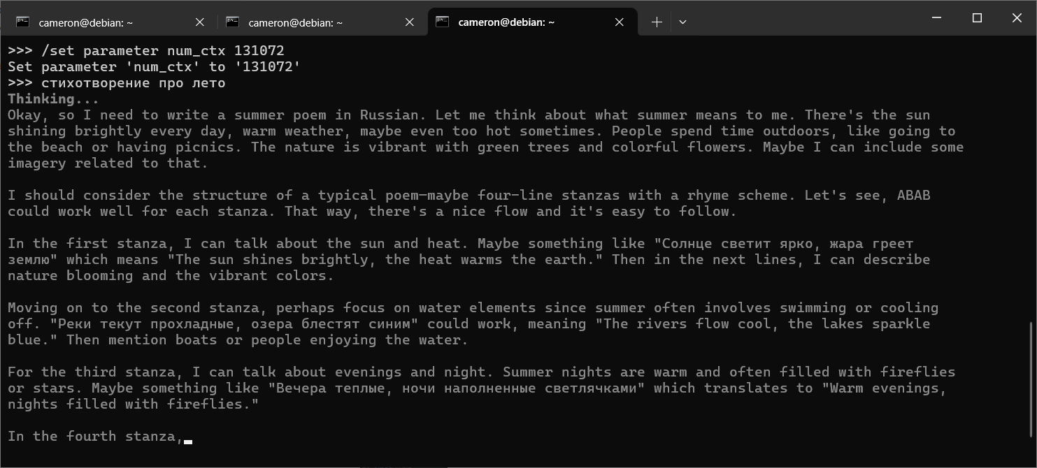 Кстати, держу в курсе. Нейронка дипсик 70В прошла мой маня-тест по исключению отрицательных утверждений из текста. С первого раза. Нейронки от 7B до 30В все обосрались. Нейронки меньшего размера даже не поняли, что от них требуется. Охуенный тест. Сравнение с онлайн: дипсик смогла выполнить со второй попытки. Из чего я могу сделать вывод, что офлайновый экземпляр на зионе оказался умнее, чем интернетный.