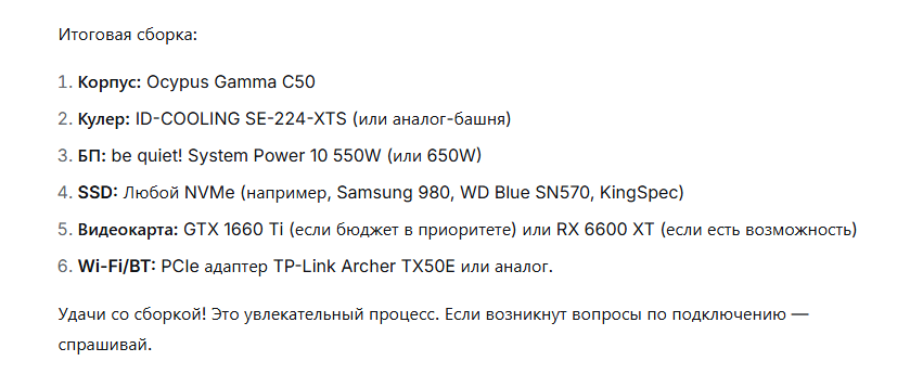Сап, аноны. Помогите собрать конфиг родителям. Бюджет 40к. Нужен полный системник с корпусом. Цели - серфинг интернета, офисные приложения, простая работа с монтированием видео типа Сupcut. Сложных видео в 4к и т.д. не планируется монтировать, простые видео. Хз на чем собирать, мне пофиг на срач интел и райзен и зионбоги.