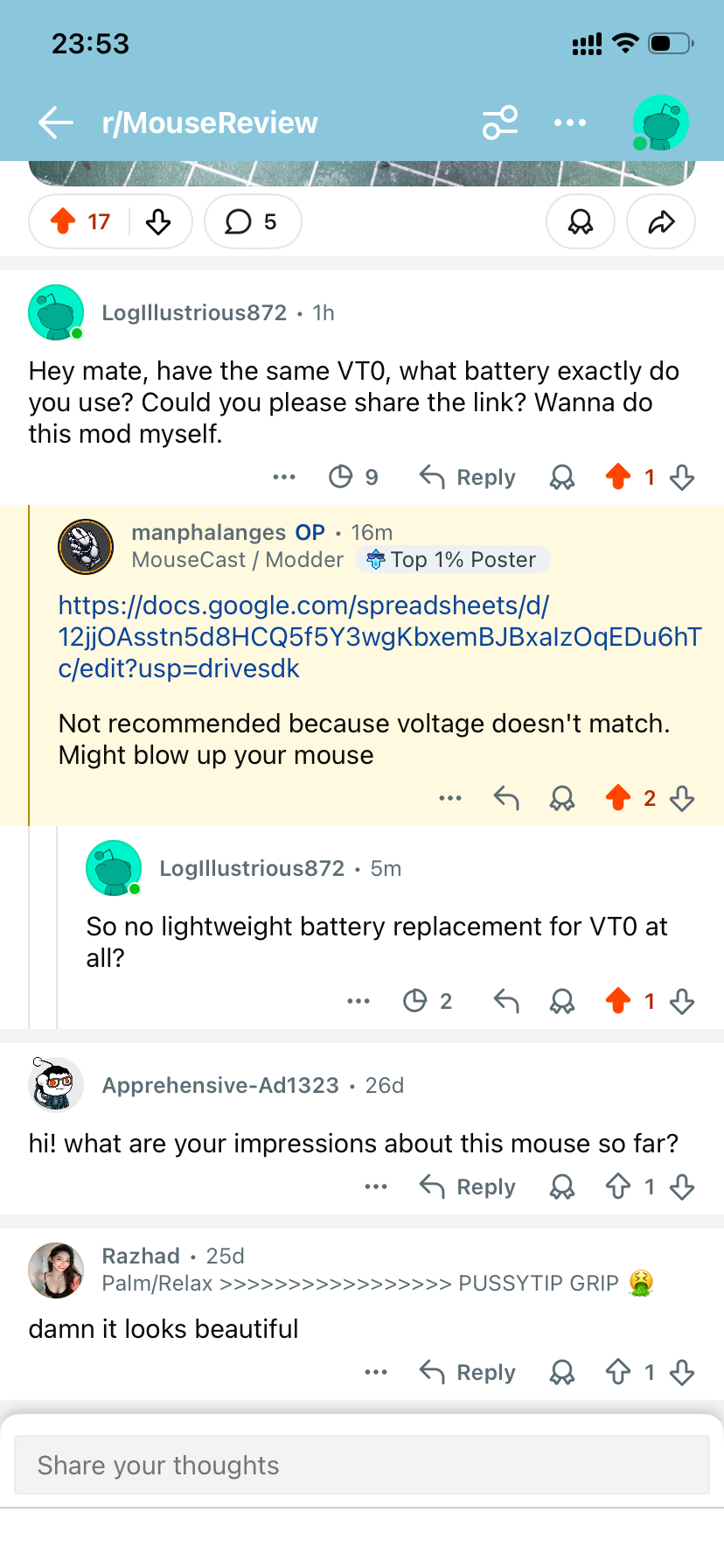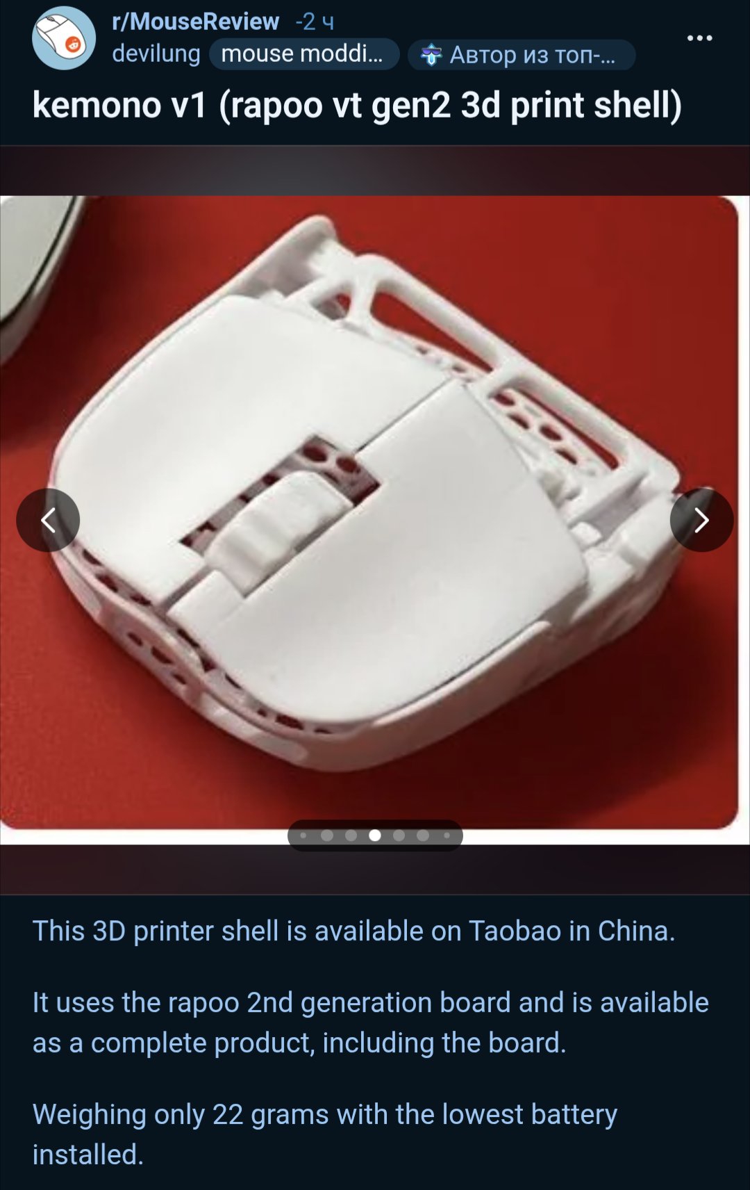 Докладываю после 2 недель использования пик рилейтед (VXE R1 Nearlink), до этого с 2019 года использовал проводной 53-граммовый кулермастер MM710, два раза перепаивая свичи (по причине сдохли и начали даблкликать) и энкодер, но антисанитарный вид и трудность очистки грязи-жира-кожи-пыли-волос из-за дырок меня достали. По итогам мне понравилась: микросвичи и энкодер норм, с датчиком и соеднинением проблем не было, софт для настройки кривополукитайский, но я разобрался, есть веб-морда с настройками и возможностью обновить прошивку на мышь и донгл из браузера, аккумулятор до сих пор не сел, использую в обычном режиме с 500 Гц опросом, так что заявленные с протоколом Nearlink 150 часов работы весьма похожи на правду, с засыпанием проблем нет.