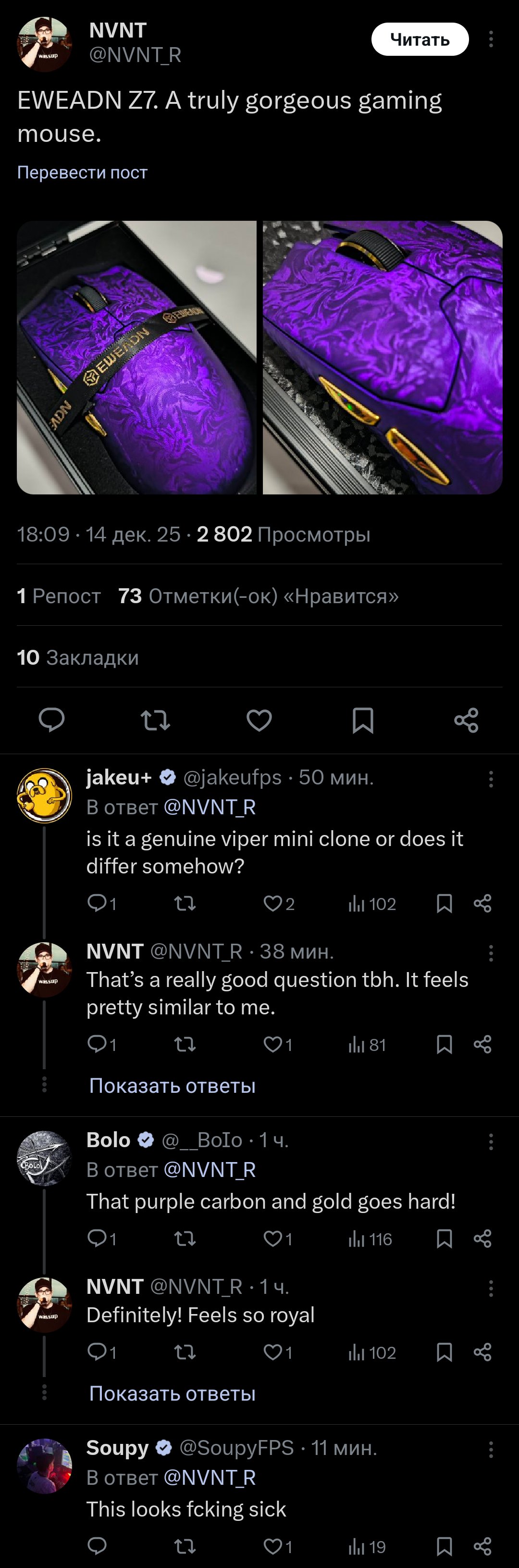 Ну что, приехала моя VT0 Max. Это пушка блядь. Покрытие охуительнейший софт тач какой-то. Качество на голову выше всяких разеров и ложитеков помойных. Прям монолитная как камень. Единственное центр тяжести смещен куда-то к жопе, из-за этого кажется увесистой. В остальном это лучшая мышь нахуй, особенно за свои бабки