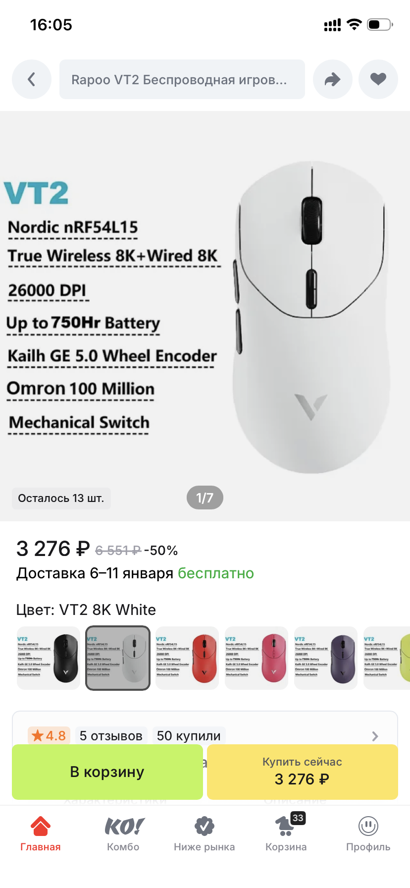 От себя могу сказать следующее: нравится, что мышка достаточно большая - как раз под мою ладонь, форма, как мне кажется, эталонная. От легкости после Х7 кайфую тоже. А вот тема с частотой обновления 8к герц кажется чистейшей воды наебаловом. Никакой разницы между 1к и 8к тупо невозможно ощутить, кроме того, что батарея высаживается не за неделю, а за 1 день (к слову, я рассчитывал, что батарея будет держаться подольше, слегка подбешивает то, что иногда в самый ответственный момент мышь начинает мигать красным, сигнализируя о низком заряде). Также не нравится довольно тугое колесико и ощущение какой-то хлипкости в исполнении.