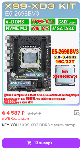 2011-3 Тут у нас даунгрейд, до материнок с ддр3 и V3 Комплект на процессоре 2673в3 стоит те же 5к как раньше комплект на 2643в4, нужно делать анлок и пердолить память. Если собирать по отдельности, то выйдет 4.5к. Так же есть вариант, взять материнку с двумя х16 и взять карту затычку+ цмпху.