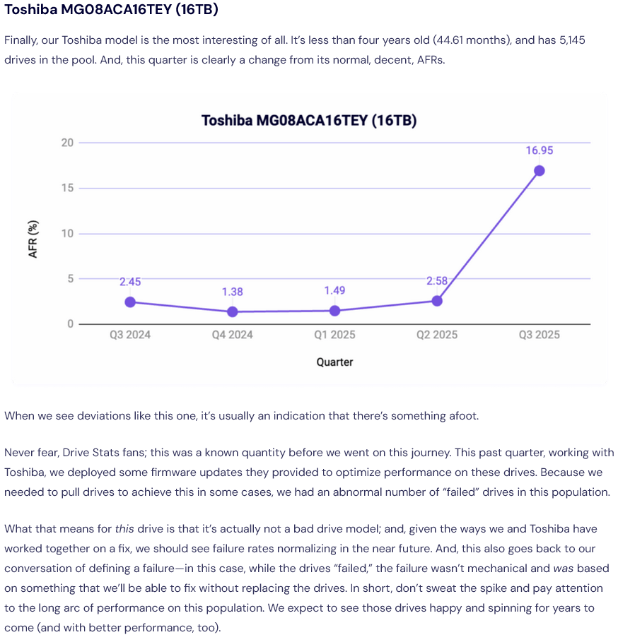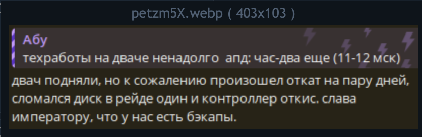 >>7644941 У меня один ультрастар на 8тб умер месяц назад. Вернее, умер он через 2 недели после покупки, а заметил я это только через 2+ месяцалень мониторинг было навешивать Умер так: 0) ZFS1 1) zfs его выкинул из пулла, сказав, что там io-ошибки 2) в ядре ошибки io 3) селф-тест смарта падает с ошибкой 4) затер нулями, отнес в сервис, одобрили обмен/возврат. Данные не потерял, зеркало же. При этом, второй такой же диск жив и с ним все ок, жёсткого io на диски нет, они тупа под ежедневные бэкапы стоят. Покупал их одновременно. Есть ещё 2 wd red plus на 4тб. У них наработки ~1,5-2 года, тоже все ок. На замену вышедшему из строя взял wd pro, пока полет нормальный. Этот как обменяю, поставлю в холодные бэкапы, как раз ёмкости 8тб хватит под личный архив. Правда, не любят они частые включения/выключения, но думаю, ничего, переживет.