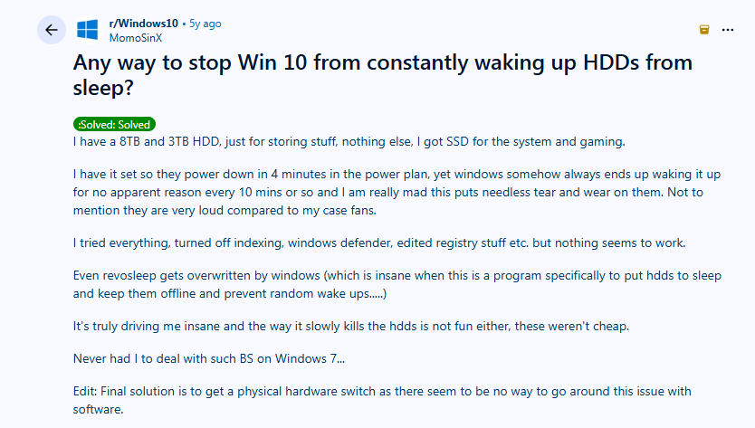 >>7644289 Если у тебя к жесткому подсоединено питание от бп, то винда 10/11 будет его ебать до потери пульса хоть усрись. Единственный выход это физически его отрубать, либо купить специальную плату с кнопочками для оключения (опять же вручную).