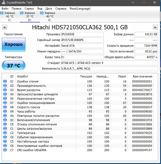 сейчас по памяти пишу смарт у него странный. часов наработки мало (около 200+-), число включений и т.д. - тоже, но однако, диск работает очень медленно. я еще помню как-то вин10 на него ставил на втором компе, но дело даже не в этом даже не под ос диск работает с файлами очень медленоо