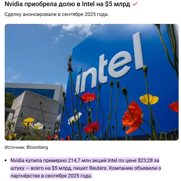 >>7616230 Интел с Нвидиа сейчас делают встройки и нвидиа знает что ей пиздец от встроек АМД, поэтому нвидиа поглотится интелом, по крайне мере будет зависима от него, потому что дискретки уже нахер не нужны никому.