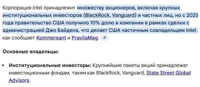 >>7616236 >поэтому нвидиа поглотится интелом Маня-аналитика от шизов с двача... В реальности нвидиа покупает долю интела... А если капнуть глубже, то окажется, что Нвидиа, АМД, Интел принадлежат одним и тем же людям, через прослойку инвестиционных фондов, таких как Вангуард и Блекрок. То есть, так таковой конкуренции нет, просто кабанчики сверху посчитали, что так будет выгодней, разделить гоев на разные лагеря, синих, красных, зеленых, закидывая в каждый лагерь плюшки по очереди, сначала подебилы синие, потом красные и так далее.
