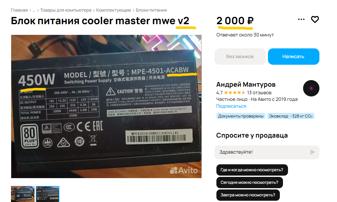 >>7622628 вот такие объявы ищи если не разбираешься в БП, то ищи только конкретно этот бп и ничего другого, иначе купишь хуету Cooler Master MWE 500 WHITE V2 [MPE-5001-ACABW] Сooler Мastеr МWЕ Вrоnzе 700 V2 [MPE-7001-ACAAB] вариков мощьности 400, 450 вт будет за глаза тебе, тк на 12в линию он выдает столько сколько написано, но если найдешь 500 700 недорого можешь и их взять