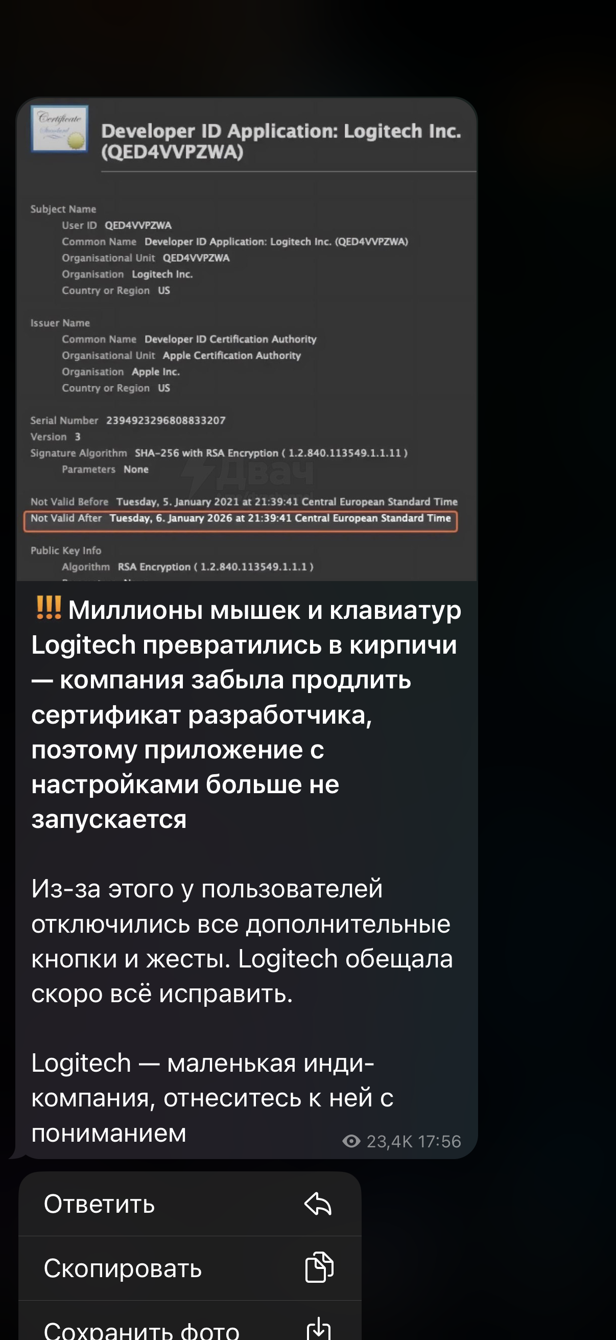 >>7622382 Logitech Options+ and G HUB are currently not working on macOS due to an expired certificate required for the apps to run. We’re working on a fix and expect it will be available soon. Thank you for your patience while we resolve this issue.