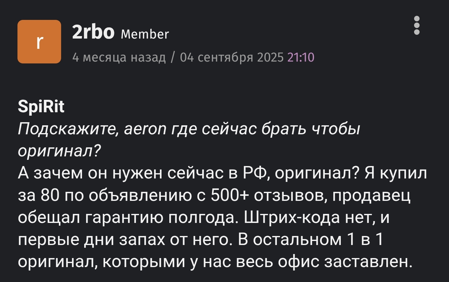 >>7615498 >>7615516 Ну то есть консенсус, что Аероны с Авито новые за 80 - реплика, причем такая что отличит только спец. На самом деле основное отличие это сетка, которая даже проходит ультрафиолетовый тест на клеточки, но ощущается немного по другому, жестко. И ебучий СКРИП с новья). Ну и >ваняииииит да) Это означает что Двач еще торт). С наступающим, стулоаноны. Желаю вам найти трон по душе (это чтобы без оффтопа в треде)