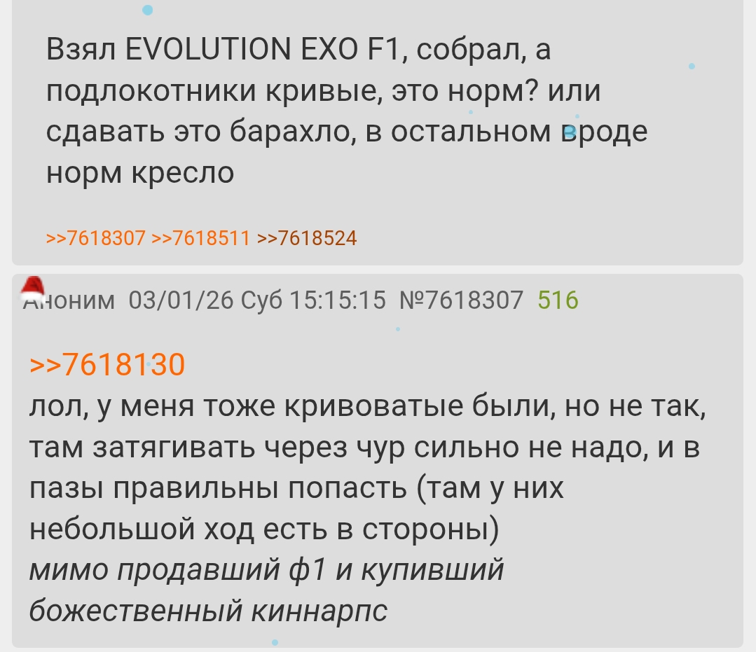 >>7619830 Ок сейчас так >>7619805 Слышал про этот лайфхак, если будет мешать их кривость то поменяю. Бля там обезьяна из ДНСа забыла прикрутить винт в подлокотники (один держится на трёх винтах, другой на двух). За это можно компенсацию получить или нахуй пошлют?