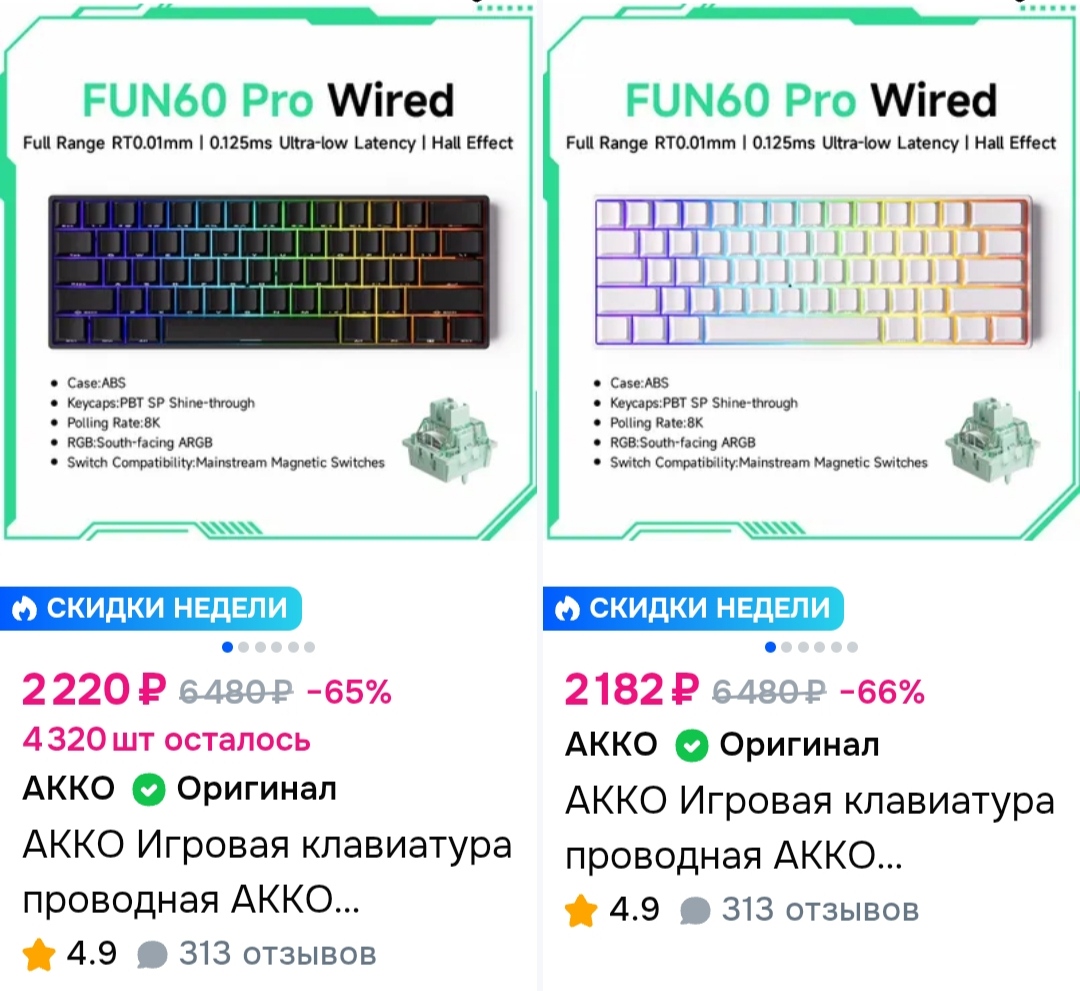 >>7629611 Я когда не шарил, а имеющаяся клава еле нажималась, сдуру заказал кейрокс (да), попользовался 5 минут, чуть не проблевался с этой погремушки, там еще местами не очень аккуратно коробку открыл, ну да ладно. И тоже приняли возврат спокойно. Про свитчи тоже обязательно блять под каждыми пишут отзывы, что не подходит на какую-то говноклаву без хотсвапа, ряя товар говно. Про кепки вообще молчу, в 99,9999% случаев придет подделка на какие-то кепки, которая полностью просвечивает (никаким двухслойным пбт там и не пахнет), буквы криво нанесены, сами кепки коряво отлиты, вот это всё
