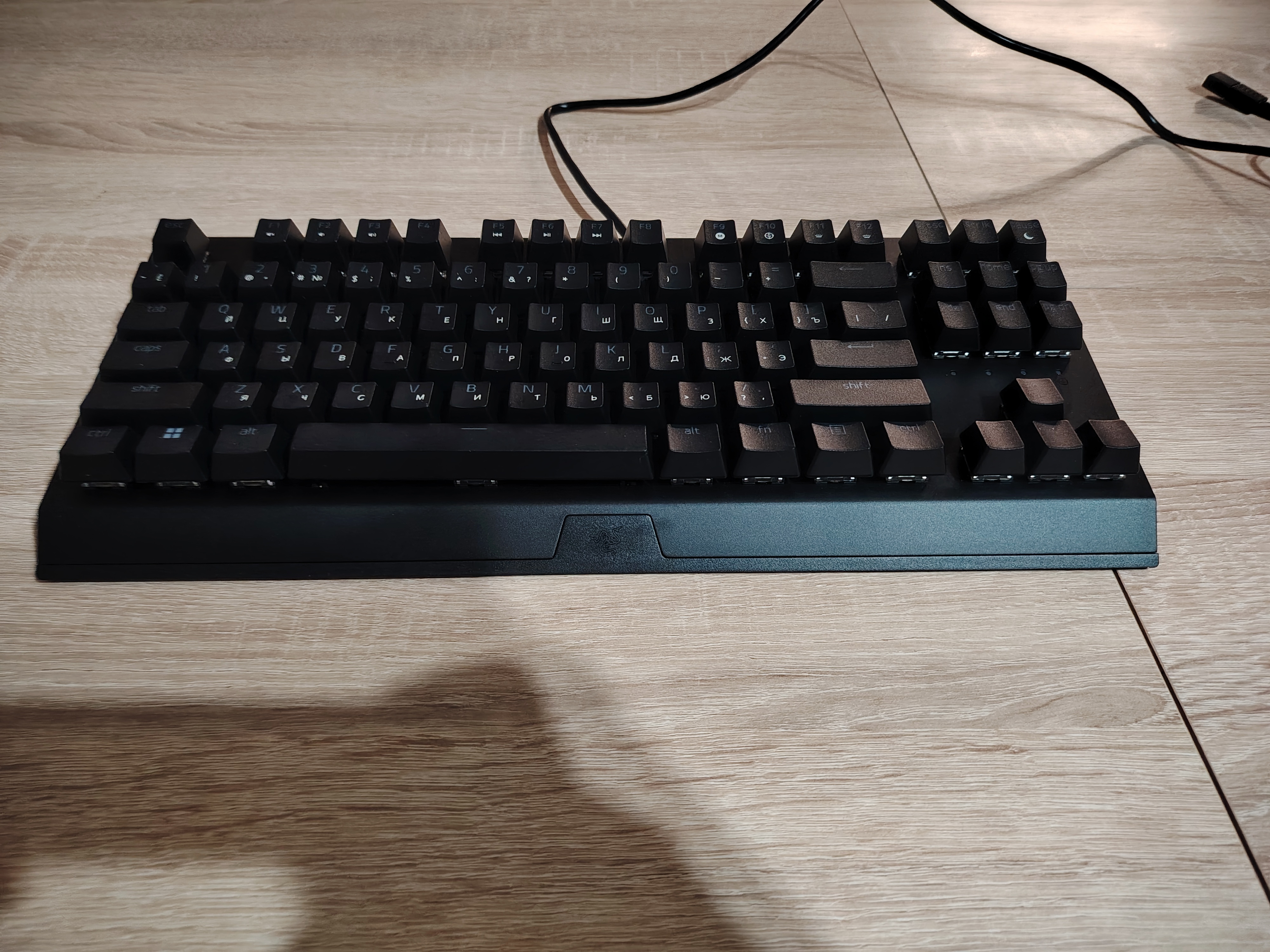 Вот у меня клавиатура blackwidow v3 с зелёными свитчами без нумпада. Я выставил подножку на 9. Тут нет подставки. Как вы держите руку? Она должна парить? К столу упираетесь? Кликает прикольно если что.