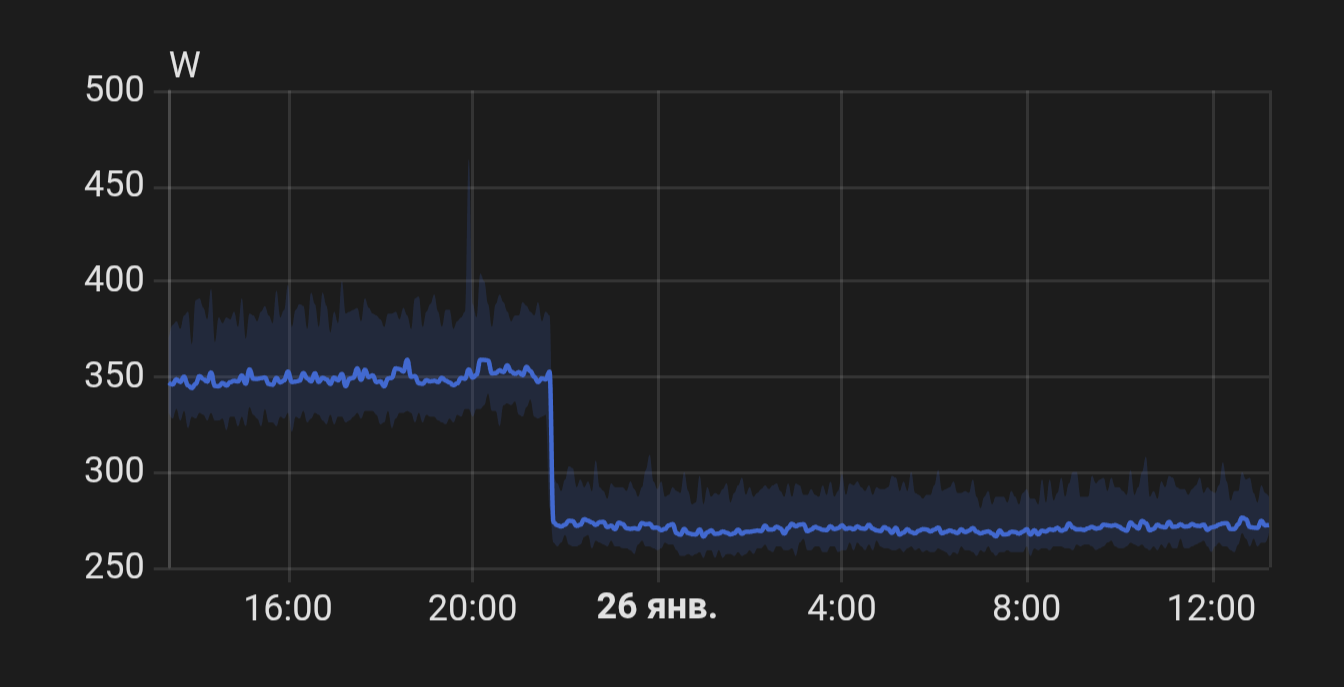 >>7643277 Примерно 80 ватт на диски уходит. Дифф на графике это performance и powersave режимы цпу. У паверсейва вижу один минус пока - iperf3 в однопотоке на qsfp+ 14-16гбит/с только, если перф режим включать то 25гбит получается (в 2 потока 35)