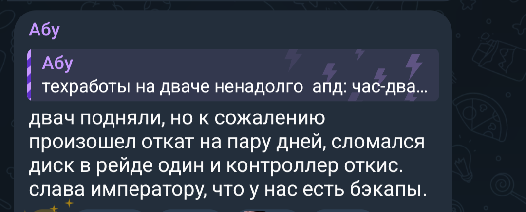 >>7648705 Да наверно контроллер погибать решил и в один из дисков хуйни насрал. Бывает. Двач, видимо, не настолько критичный к даунтайму сайтик чтобы иметь в сервере БД два контроллера, у каждого из которых своя половина зеркала. Ну и база там какре-то mysql производное поделие, наверн, и бэкапится дампами, а не непрерывным потоком, как взрослые БД.