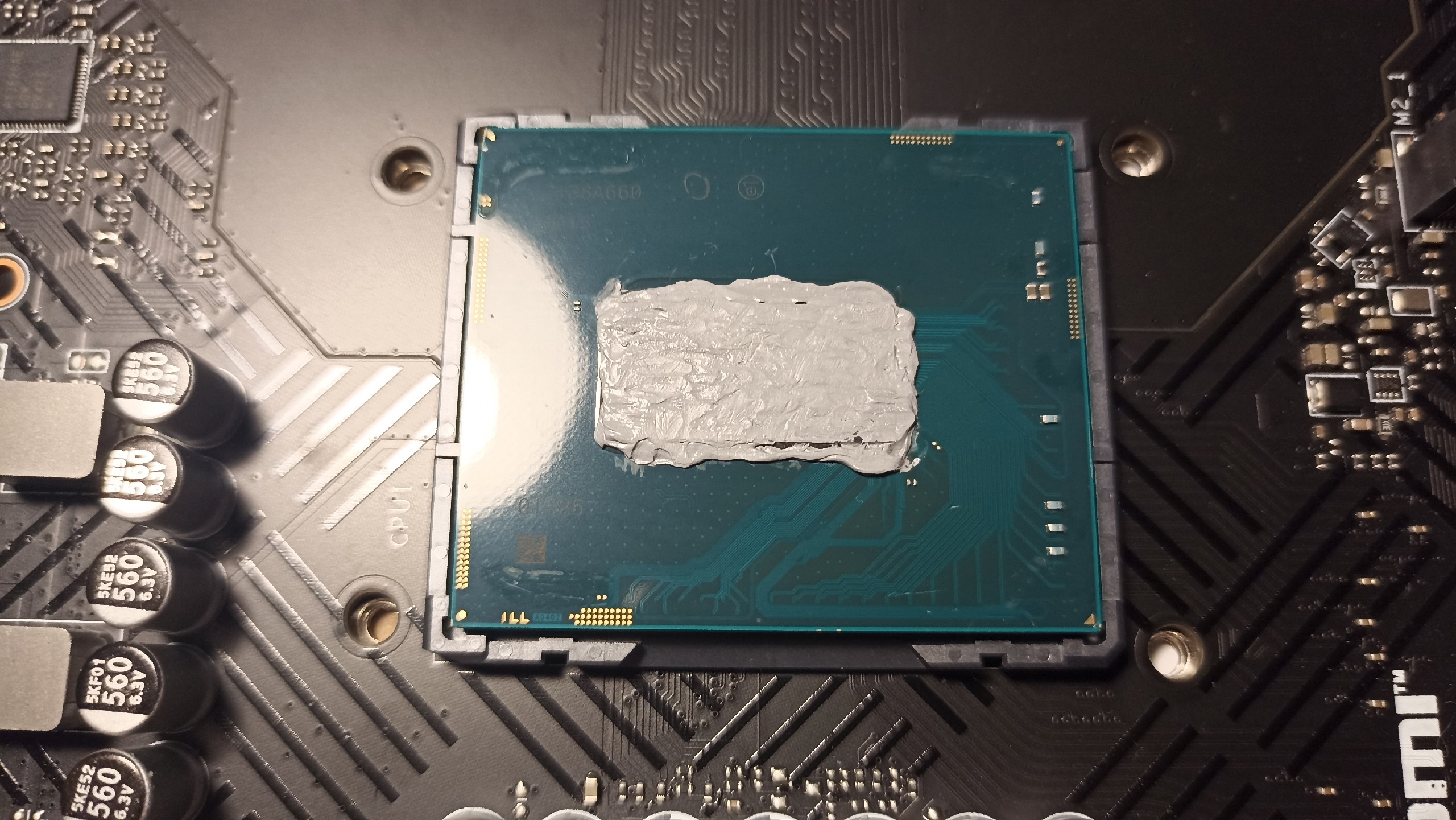 >>7647332 Рассказывал, купил рамку под сокет 1700. Думал какого хуя температура растет с рамкой. Чуть туже закрутил, стало лучше, но все еще далеко до родного прижима, потом смотрю, рамка криво встала, крышка процессора криво торчит, ну думаю герметик мешает, срезал его, все равно не встает, пока елозил, крышка отвалилась. Ну и собственно видно, в чем проблема, крышка другая.