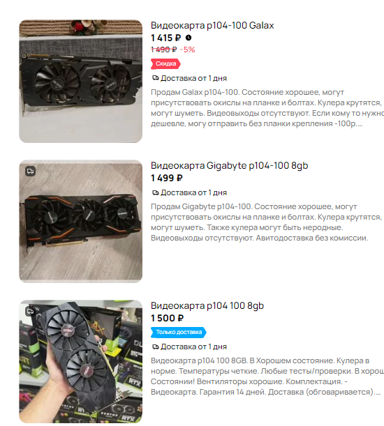 Видеокарты Майнерские видеокарты нвидии, от своих аналогов -10%: P106-100 аналог обычной gtx 1066 цена от 1500 до 2500р за вменяемый вид. CMP-30hx аналог 1660супер от 2000 до 3500р с уже готовым х16. CMP-40hx аналог 2060супер(порезаны тензоры) от 6000 до 8000р с х16. Из главных особенностей, нет видеовыходов, картинку нужно выводить либо через встройку, либо вторую карту-затычку. Онлайн игры с изи-античитом на последних драйверах не работают. Подробная инфа и сам драйвер тут https://github.com/dartraiden/NVIDIA-patcher Далее идут видеокарты "франкенштейны", гпу из ноутбуков на обычных десктоп-досках: 3060м чип чуть мощнее обычной, тдп ниже, 6гигов, в некоторых вариантах 1 hdmi, цена около 10к. 3070м\3070tiм\3080м это все -+ обычная ртх 3070, выбирать, что выгодней. Диапазон цен 13-16к. Пост по тестам карт в бенчмарке треда >>7574944 → → →