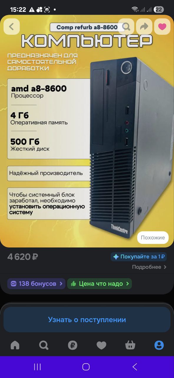 В командировке купил 2 одинаковых lenovo m715s за 5к с 4+4 ддр4 сосунг, 500гб хард 3,5" сигейт, a8 что-то там со встройкой и пустой за 2к (блоки питания и охлады на турбине в обоих, естественно). Ну, такое, телевизор 40"+- 720р не тянет от слова совсем, если речь идёт про игры, а для интернета этих ваших, думаю, годен (хуйня здесь интернет, пиздос). В комп за 5к вкинул ryzen 5 1400 (ревизия строго "AE", то есть самая первая) и gt710 2gb gddr3 (ddr3?) и прям хуета хует практически во всех играх на минимальных минималках в минимальном разрешении... Но, скорее всего, на HD мониторе 19-24" всё будет нормально (так кентик сказал, мол плазму не тянет из-за диагонали, но я вообще хуй знает). Тот огрызок со встройкой оставлю с ссд 60гб, этой 710 и 4+4, чтобы просто видео воспроизводил и мессенджеры открывал, хуй с ним! Ещё торренты качать с него буду, лол. Во второй докину что-то посерьёзнее в плане видеокарты (скорее всего, сделаю кастом колхоз крышки и прикреплю на стоки рейзер с картой без питания типо 1050 2гб/rx550, ибо доп питания под карту нет, ещё три плашки по 4гб., да и всё. Хуйня или да?