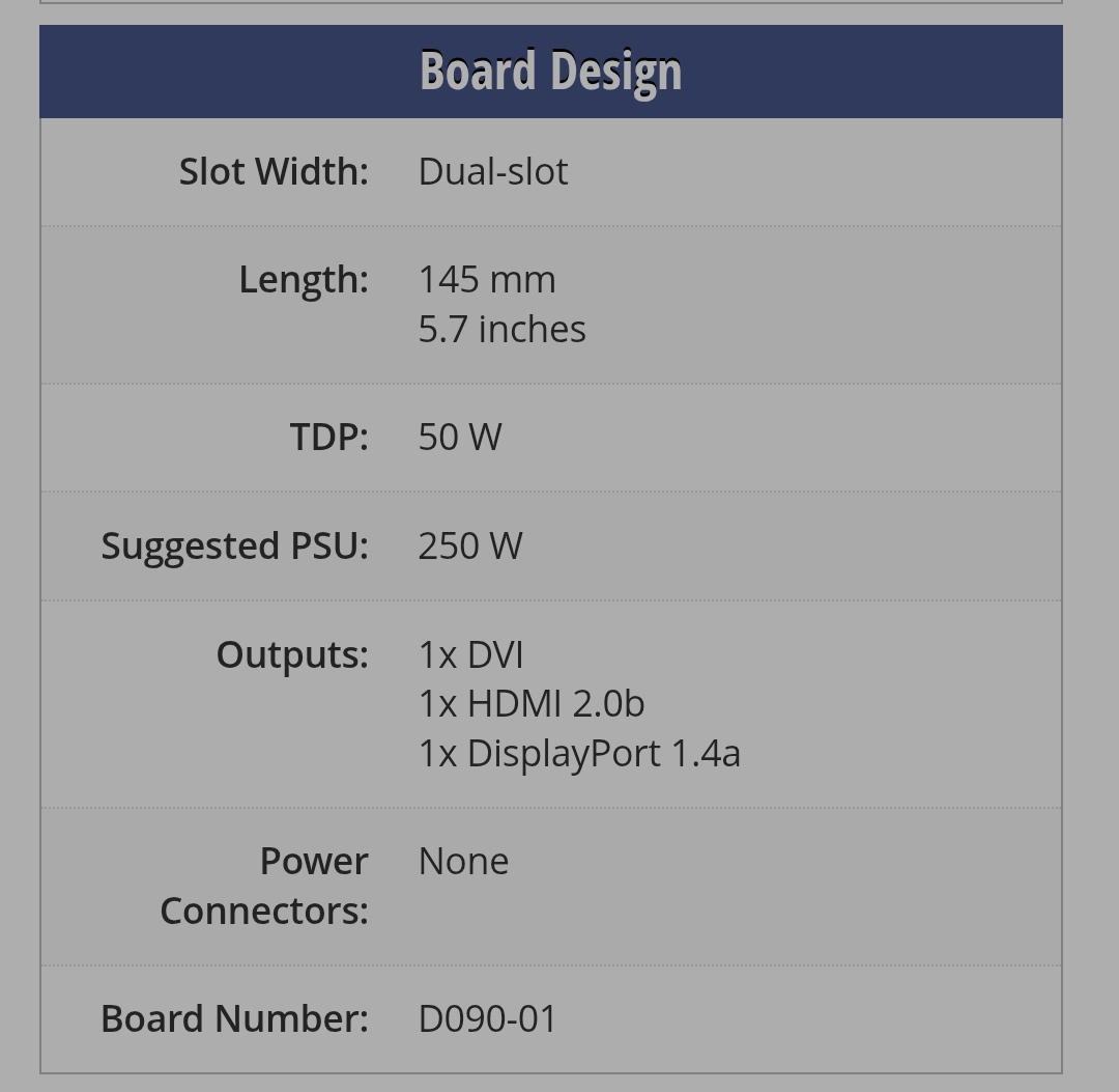 >>7685899 Слабее и дороже 580, только 4 линии pcie, нет энкодера, декодирует ютюб точно так же как и 580. Если нужна lp карта без доп питания лучше 1650 взять