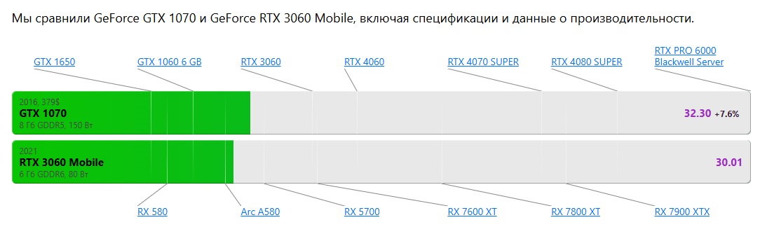 >>7685059 Ну вот держи пруф. >>7685063 Просто скину разрешение тексту с ультры на высокие. Твои таблички с тестами говно полное, можешь их больше не скидывать. 3060м имеет чип с большим количеством процессоров чем у обычной, но имеет меньше ТДП, то на то выходит, что они равны по производительности. Пик2 прямой тест сравнения с 1660ы, что примерно 1070. Пик3 сравнение 3060 с 1070 с другого видео. То есть у тебя с картинки слишком дохуя производительности для 1070 рисует, а 3060м всего скорей та, что в ноутбуке будет стоять, а не в виде карты. Но я понимаю твою ситуацию, купил отвальный турбинный обогреватель, теперь нужно как-то устраивать перемогу. Вангую, еще пару тредов на вопрос "какую карту купить" будут советы от семенычей с 1070.