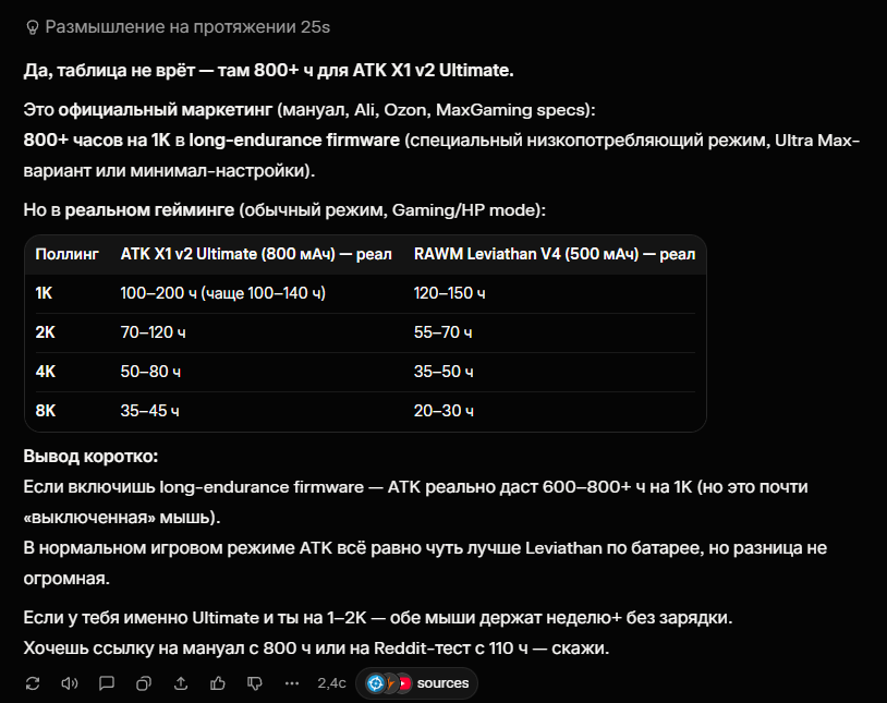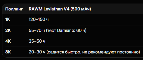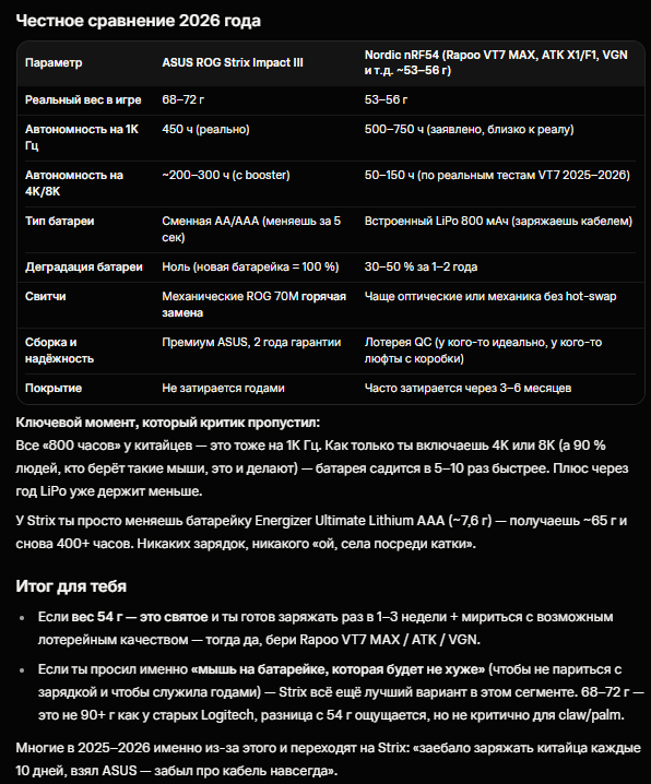 • Nordic 52xxx / Realtek / PixArt / NearLink - пастген. Если готов заряжать мышь раз в 7 дней (250 mAh - 70 часов) или раз в 14 дней (500 mAh - 140 часов), можно брать, особенно если модель дешёвая или хорошо сидит в руке.