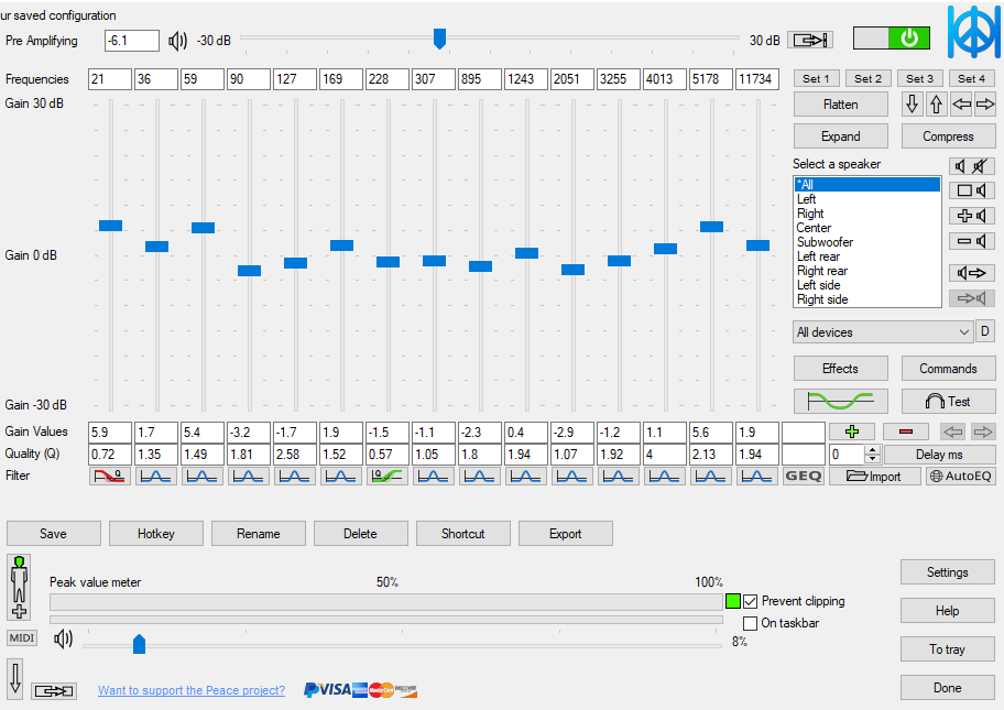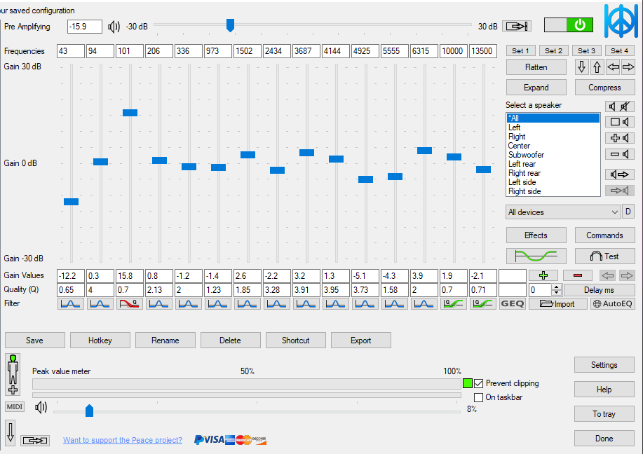 >>7677395 >PEACE Так и не понял почему все так наяривают этот блоат. Встроенный конфигуратор в Equalizer APO тупо пизже и удобнее. Интерфейс в peace делал уебан, которого не стоит подпускать к UX/UI.