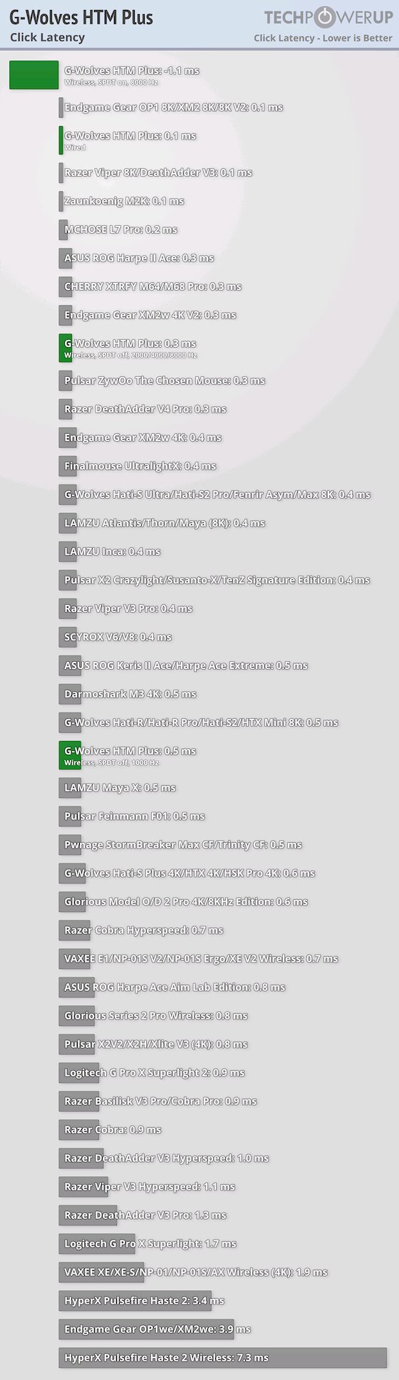 The HTM Plus comes with a new feature, although this one is already familiar from a different manufacturer. Much like the OP1 8K and other mice from Endgame Gear, the HTM Plus implements a technique called SR latch. For this to work, the switches this is realized for require a top contact in addition to the usual bottom contact. Such switches are called SPDT (single-pole, double throw), and since these aren't too common, G-Wolves implemented a custom SPDT switch from Huano. With SR latch enabled, a click will already be registered upon the top contact being opened instead of having to wait for the bottom contact to close, reducing physical latency in the process. In my testing, enabling SR latch (or "SPDT mode") reduces physical latency by 1.36 ms, which is highly substantial. At 8000 Hz, the HTM Plus already has among the lowest click latency at 0.3 ms in wireless operation and at 0.1 ms in wired operation when using the lowest debounce time setting, and by enabling SR latch, one can cut down on physical latency even further. https://www.techpowerup.com/review/g-wolves-htm-plus/