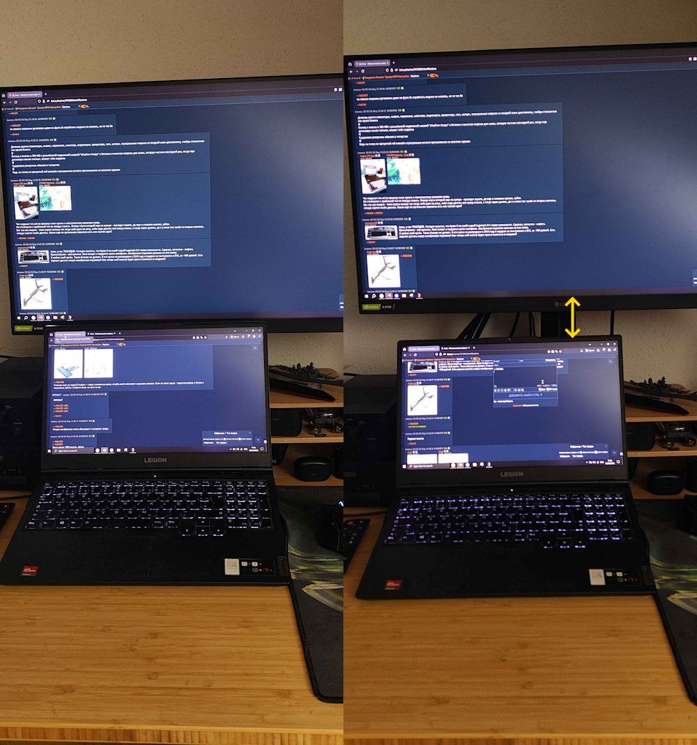>>7681068 → Не, это совсем не варик. >>7681073 → У меня проводной разводки очень много на миллион девайсов подключенных, как это всё так сильно вверх торчать будет чет хз Не, конечно есть возможность поднять второй моник вверх (указал желтым насколько) но это уже тогда неудобно мне и надо буквально шеей изгибать чтобы вверх смотреть. Если бы какой-то столик сантиметров 10 высотой можно было бы сделать таким образом чтобы под него чутка клаву задвинуть, но все такие столики турбовсратые. Короче походу пролёт.