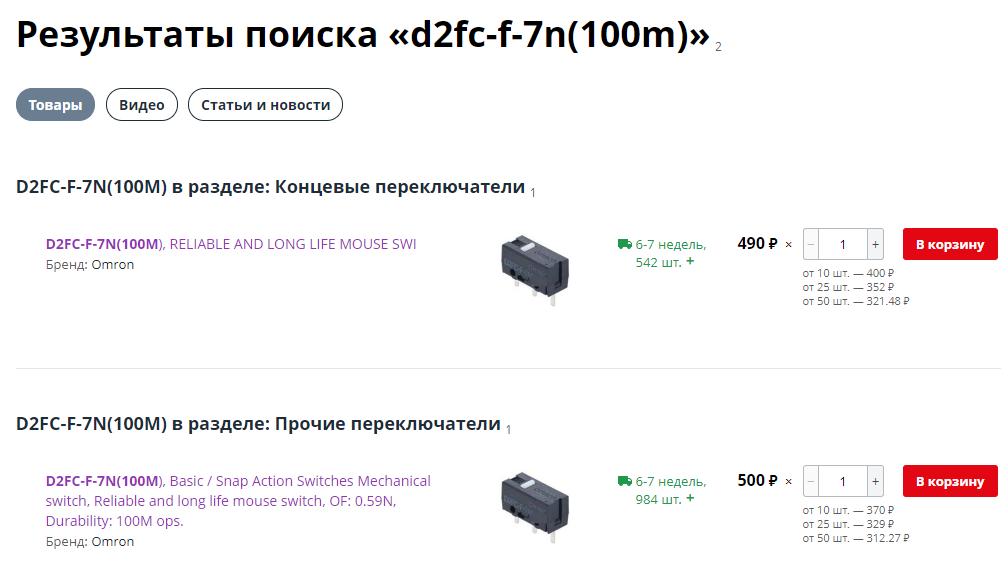 Заказал в ЧиД свитчи Omron D2FC-F-7N(60M) для своей старушки G700s (ей уже лет 15), по 133 руб за штуку. Взял сразу 4 шт. Вместо них прислали топовые D2FC-F-7N(100M), которые стоят 500 руб за штуку, со сроком ожидания 6-7 недель. Ресурс - 100 млн нажатий! Я в ахуе. Вселенная меня любит?