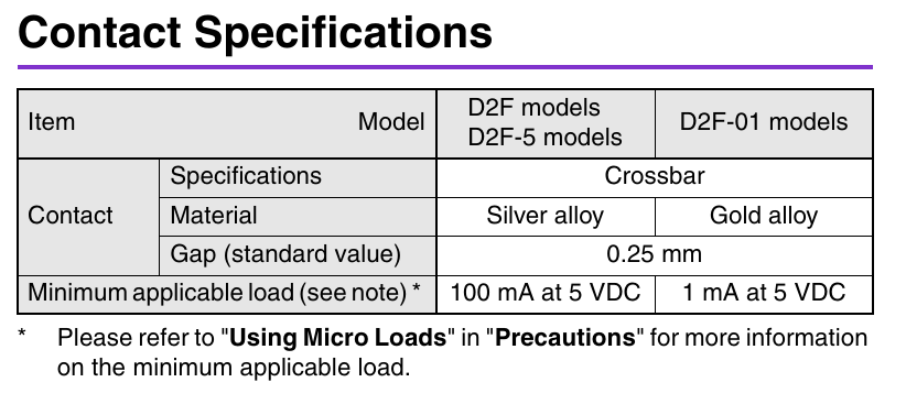 >>7684815 Я выше скрин даташита давал, там такое же низкое напряжение и ток. У тебя механический ресурс 1 млн, там - 5-100 млн. Достигается это именно конструкцией и/или материалом пружинящей части. Не триггерись на наличие золота, это шиза уровня аудиофилии. Там сложные сплавы с добавлением палладия/платины и прочих редкозёмов, чистого серебра или золота давно нигде нет. >>7684818 Чел, ну разбери старый уставший свитч, глянь под микроскопом или макросъёмкой, сам контакт там будет чистейший. Можешь протереть, собрать, поставить в мышь и убедиться, что это ни на что не повлияло. В мышке не те токи и напряжения, чтобы контакт сколь-либо значимо изнашивался электрически. Сульфиды от долгого простоя механически стираются во время работы. А ход толкателя ограничен корпусом, так что убить контакт недюжинной силой - затруднительно, мягко говоря.