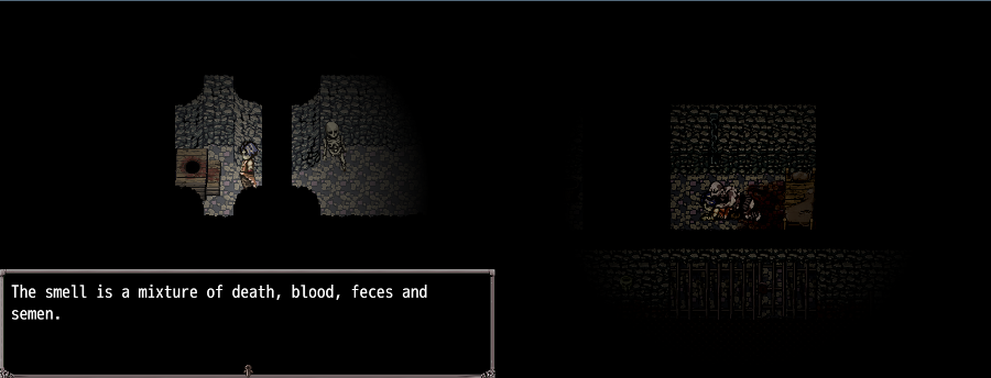Не нашёл - создал. Хоррор-rpg, сделанная на рпгмейкере, с элементами roguelike, в которой (поначалу) начинать новую игру вы будете чаще, чем загружаться. Здесь в любом бою вы можете потерять руку или ногу. Здесь первый же моб-охранник изнасилует вас в жопу, оторвёт ноги и бросит гнить в куче трупов, но игра на этом не закончится... Здесь вы можете провалиться в сральник и умереть в куче фекалий, не смогши выбраться обратно.