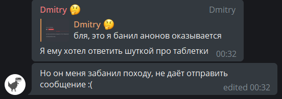 >>3891 но если это не ты был главным шизом, а ты случайно попал под раздачу, предлагаю не дуться, бан на сосаче лол, некоторые по 20 раз на дню такие получают, что ты ждал от обезьяней параши?. да и димас тут ни при чем, он потребовать тебя разбанить не может. пости что хочешь на официальном телеграмме и дискорде.