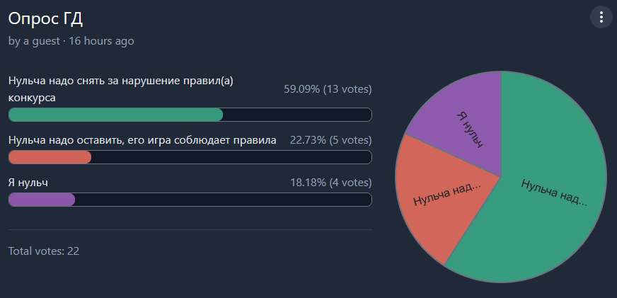 >>3891 Кто то сделал забавный вброс уровня гд, что игра скопирована. Ну, в-первых, я на гмтк заходил уже только после выкладывания финалки. Во-вторых, вы этот гмтк видели? Там 6000 игр, из них многие про цепи. А та занимает 4000 место. Серьезно кто-то стал бы листать 4000 игр, чтобы выбрать идею, которая и так очевидна? Лол.