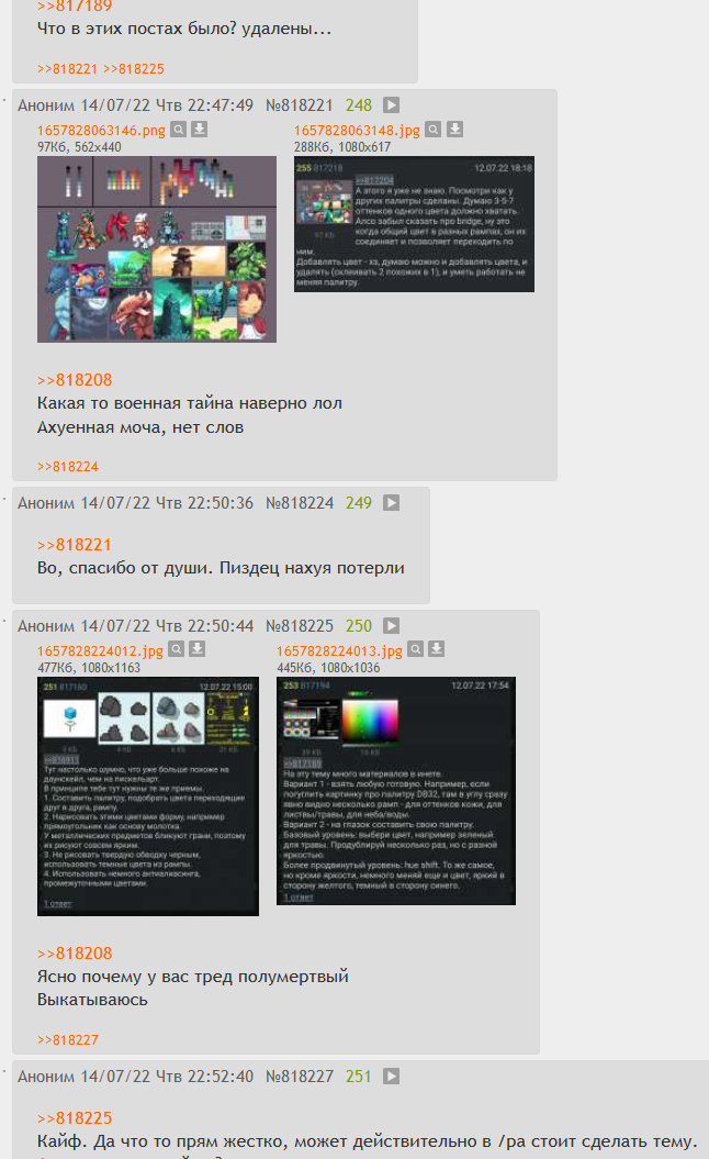 >>4171 Ну я бы тут с тобой не согласился. Как по мне, всеже инфа на двачах должна храниться в виде треда хотя бы неделю, может две, пока полностью не смоется и не утонет. Вот возьми хотя бы тот же пикселяч тред. Предыдущий создан был 09/08/22, а нынешний 03/11/22. И ведь они все еще есть и тонут потихоньку. №15 тред вообще от 28/03/21 и до сих пор в архивач не попал. Заходи, читай, смотри. Че жалко пару сотен постов, где мы будет нейронками срать и обсуждать это. Надо блять обязательно потереть, удалить все. Пускай до бамплимита дойдет и тонет себе, хули лезть. >>4170 Ну кстати да, как вариант. Селедка что сама нихуя не делает, ибо прогресса в игре котла ноль, но при этом бугуртит, от того что другие творят как им думается. Ненависть! >>4172 Да у этого дурака уже наверное не стоит, так же как не стоит на геймдев. Игростроевой импотент, как и в жизни.