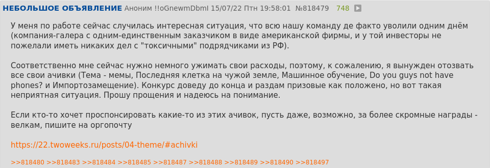 Вместе мы победим! Пострадавших от банов и от распила на конкурсе после финалок прошу в тред, будем обращаться к обезъяне или катать заяву на оргов.
