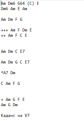1. Гармония. Была собрана статистика аккордов в 500 песнях русского рока. Слава Б-гу, не мной, я бы умр все это слушать. Отобраны самые частые последовательности (на пике отмечены плюсами). Если утрировать, то в русском роке первые три аккорда из западного рока, а четвертый - блатняк. Рок, рок, рок, блатняк. Рок, рок, рок, блатняк. Похоже, это сразу включает режим "душа". Еще одна пара аккордов (отмечена звездочкой) была включена, как часто абузящася Бутусовым. Она использована в третей части композиции, вообще там должен был быть припев, а получился проигрыш. Чуть чуть про него напишу в части про разнообразие. Пара последовательностей была зарезервирована на другие саундтреки, до которых руки не дошли.