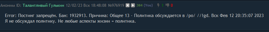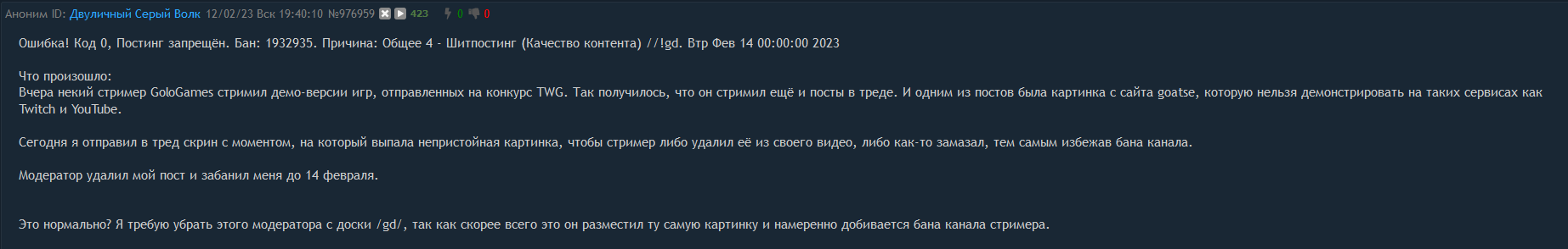 >>4162 Нет смысла читать причину бана в гд. Скорее всего модер просто не может выписать бан, не выбрав какую-то причину в списке. Выбираются же они абсолютно рандомно. Причина же бана очевидна, ты >высказался о нём недоброжелательно о том, у кого есть доступ к модерке или друзья в модерах. А политику выбрали, скорее всего, потому что там кто-то написал что это украинская фамилия.
