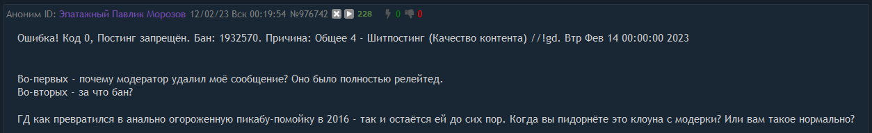 Но у нас же так нельзя. Сразу бан, пресечение любого диалога. Нахуй нам свободное общение, давайте харкач в пикабу превращать. Пидорасина.